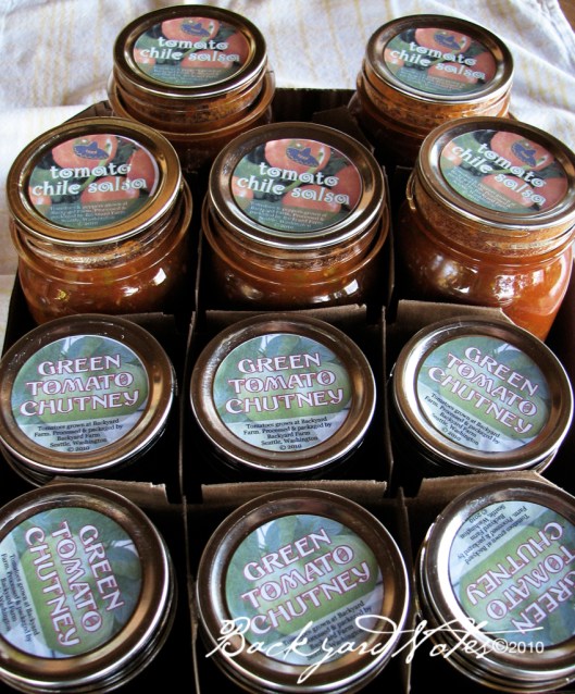 DESPITE THE UNSEASONABLY COOL SUMMER HERE I was able to put up quite a bit of produce from the vegetable garden. The paltry crop of peppers–seven pounds of mixed green (read unripe) peppers, Anaheim/long green, anchos, sweet Italian/pimento types, and jalapeno were combined with ripe, slightly ripe and green tomatoes, and became Tomato-Chile Salsa a week ago. The tomato plants came out of the ground to make way for fall planting of garlic on Wednesday of last week and five pounds of green tomatoes were turned into Green Tomato Chutney.