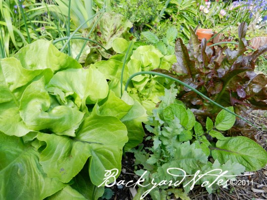 AS I NOTED TWO WEEKS AGO in this post I am often a lazy gardener or maybe I’m forward thinking. The bed above was planted last fall with immature shallots and purple potatoes, lettuce starts, of which two are volunteers, the red oakleaf and radicchio. This means I will have heads of lettuce to harvest while I wait for my new starts to reach transplanting size and the potatoes and shallots are months ahead of the normal spring planting schedule and growing well. The air and soil temperatures have been so cool well into April that I have not had the enthusiasm to get the beds tilled and sown. Lettuces and members of the brassica family are sprouting in the coldframe and cukes and squash are starting in the house under lights, along with tomatoes, peppers and eggplants. I haven’t been a complete lazy bones!