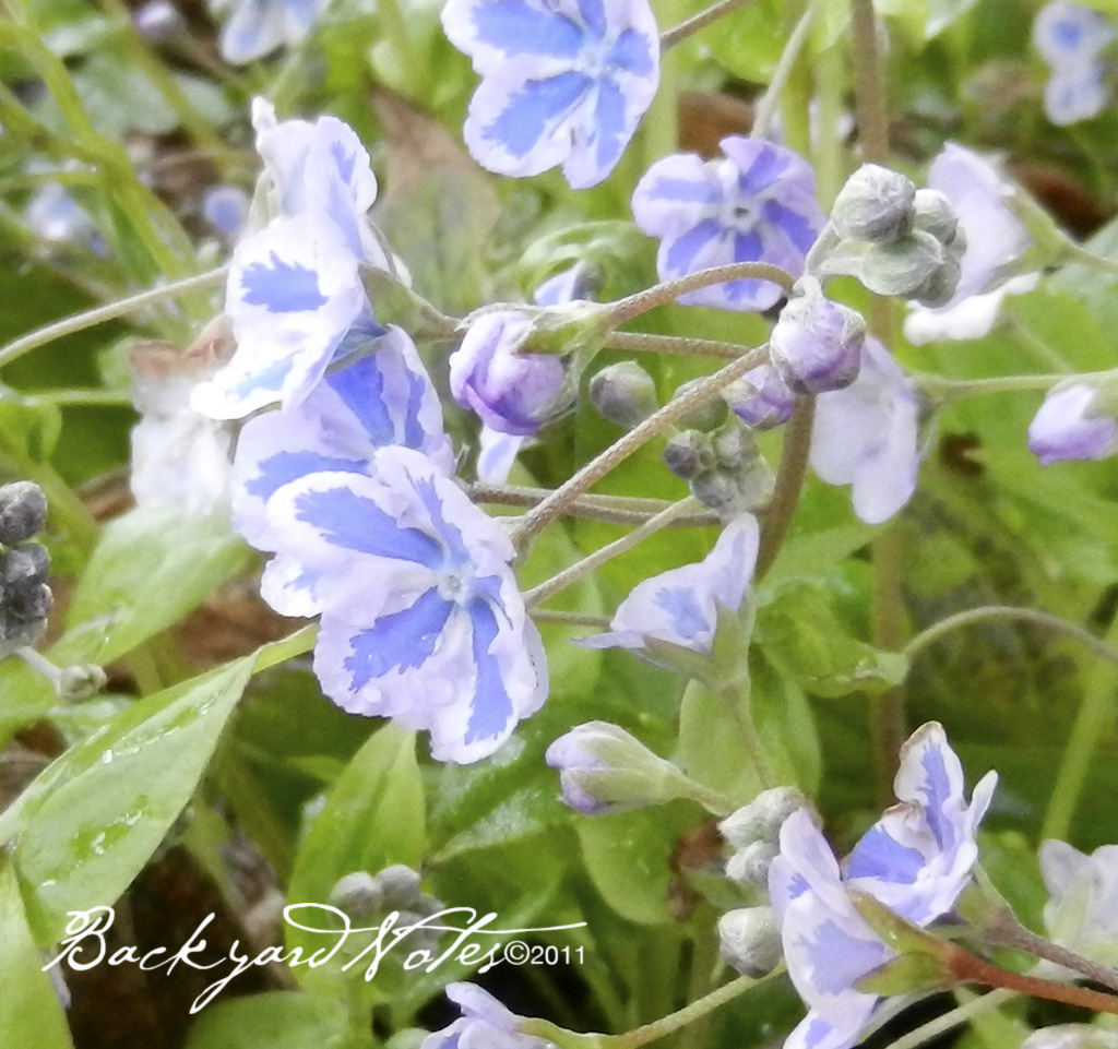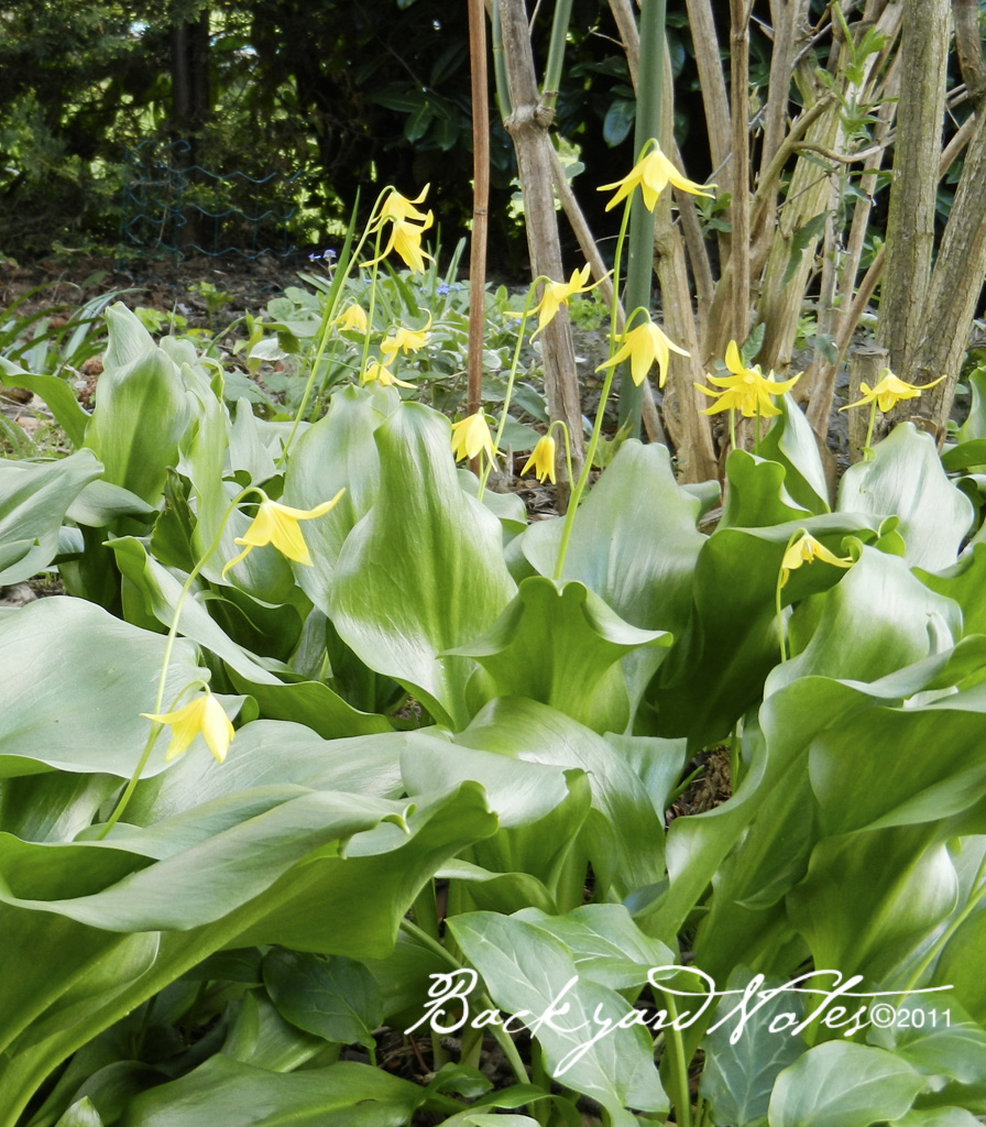 THESE NODDING BEAUTIES ARE erythronium tuolonmense ‘Applegate’ (according to plants.usa.gov see link at right) from Grandma T’s garden. They are native to California and she most likely obtained them from a friend. They colonize/naturalize very slowly. I planted about six or eight tubers in 2000 under leycesteria formosana. After blooming the foliage dies back by June and they go dormant until about February when the foliage begins to re-emerge.