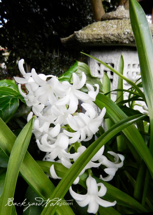 Two photos today. I think white hyacinths are irresistible. They bring needed light in deep shady spots and seem perfectly happy with a little afternoon sun. And they have a heady, sweet and spicy scent too. I have white hyacinths only; somehow they seem silly and gaudy in pink and blue.