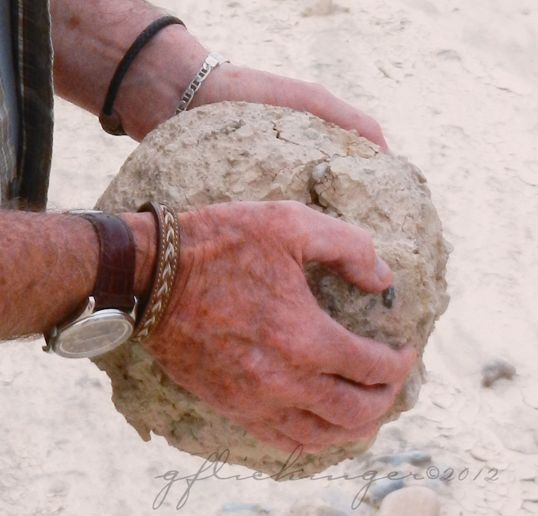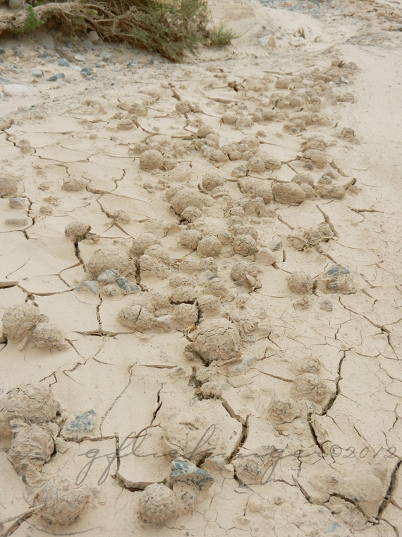 About ten minutes into our walk, we started seeing little balls of mud, “stuck in the mud”! Very curious sight. As we walked farther south and downslope from the campground we found ever larger balls. It was thrilling to see them and then try to figure out their origins. Forty minutes on, we started seeing balls nearly the size and weight of bowling balls!