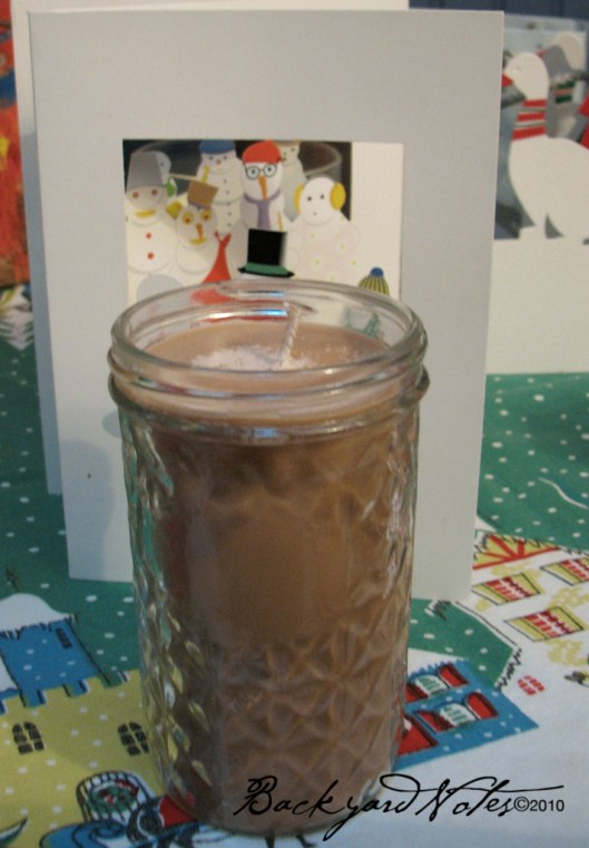 Now there are two candlemakers in the family; Gretchen too,(girlfriend to one of my nephews) makes candles. A few months back, I had given her some small quilted Ball jelly jars (no longer made and no lids are available) and she turned them into cute little soy wax candles. She also makes nice little candles in tins (with lids).