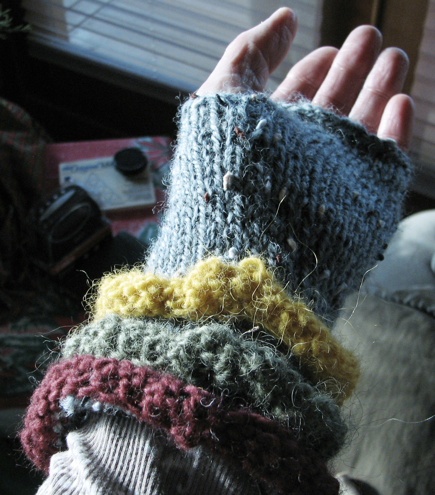 The women at our Christmas day gathering really got lucky this year. Deb made cozy wristwarmers/fingerless mittens for us. Mostly made from scrap yarn they are a clever way to use it up and be useful at the same time.