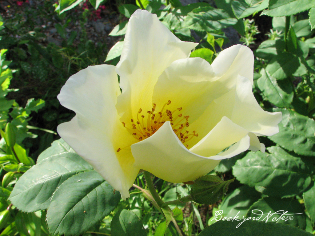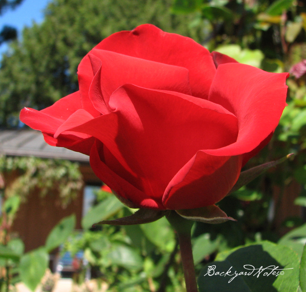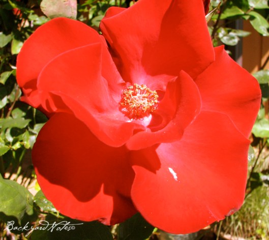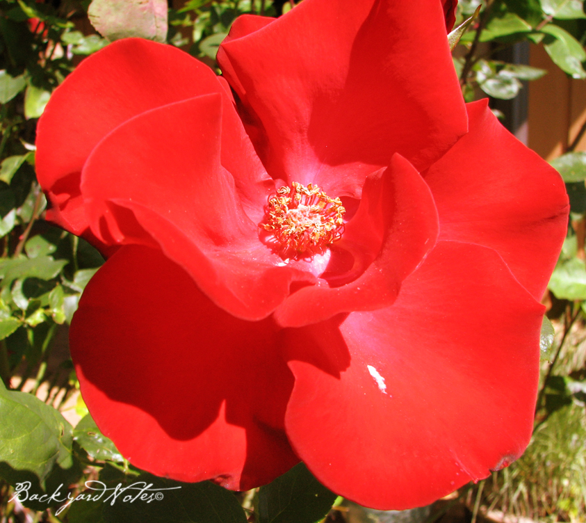This climbing rose is ‘Altissimo’. A beautiful deep red with petals that look and feel like silk. It grows to about seven feet and has a simple petal arrangement when open.