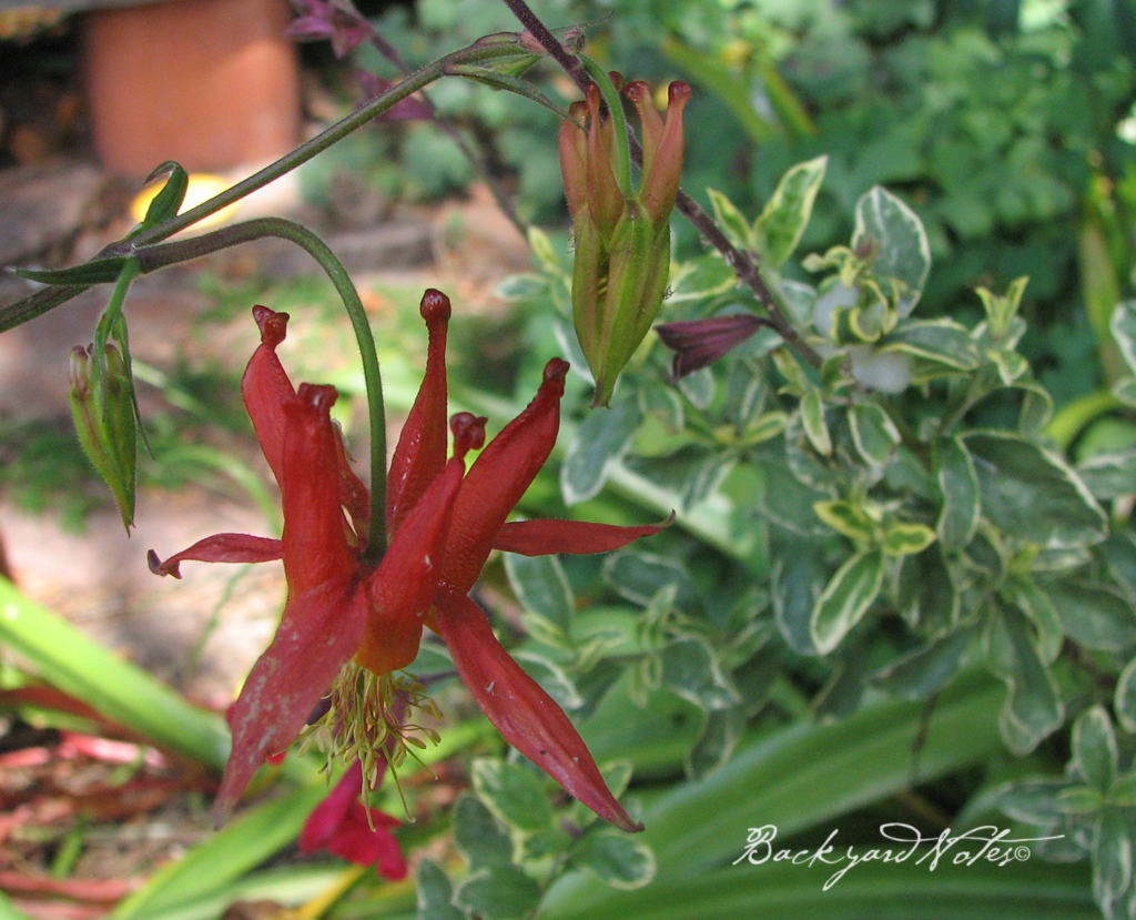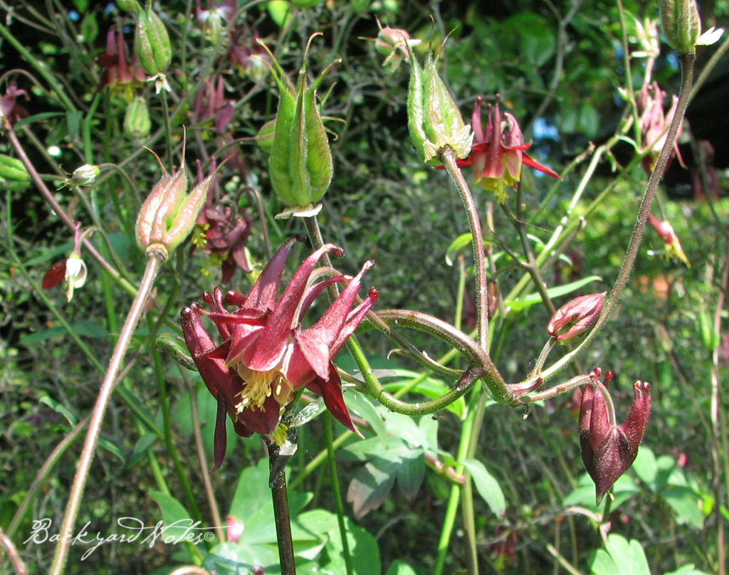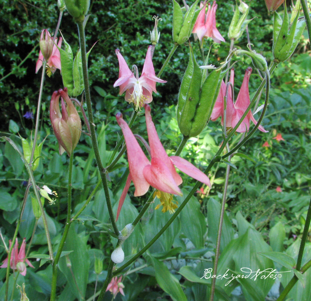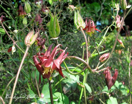 Dainty and swaying on tall, thin stems are columbine. The one above is our native Western columbine, aquilegia formosa. Columbine are prolific seeders and breeders. This one has crossed with others in the garden thanks to pollinators, to produce a light pink one and a sort of maroon one, among others while still keeping the same form.