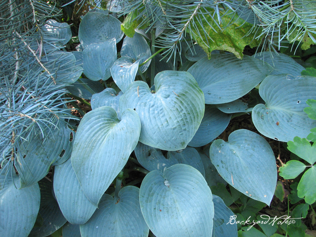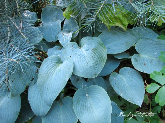 This blue hosta ‘Halcyon’ is under a weeping blue spruce, abies concolour ‘Blue Cloak’. I can’t decide if I like this combination. It might be too much.