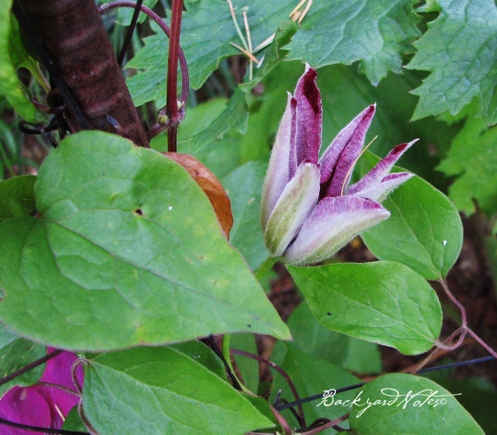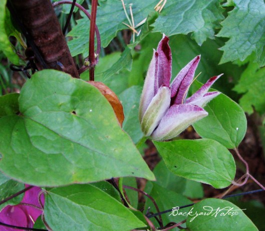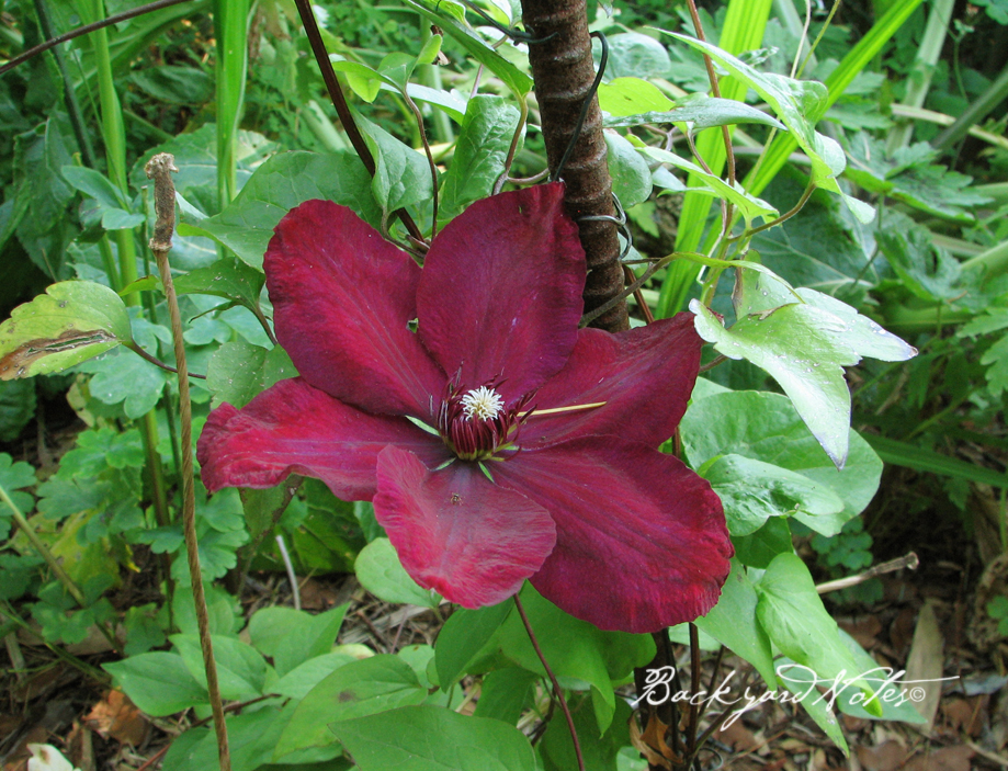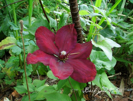 This is a great clematis that we bought three years ago. I cannot find the tag, so do not know its name. We put together three ten foot lengths of rebar into a tepee shape for the vines to crawl up. It an unusual red, I think.