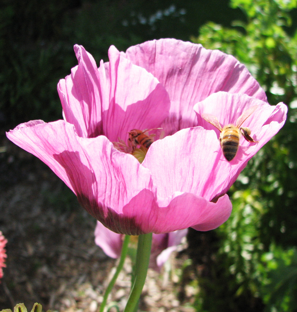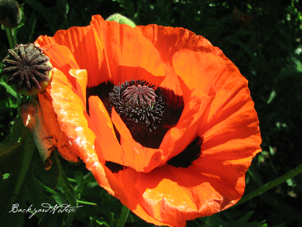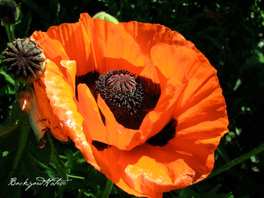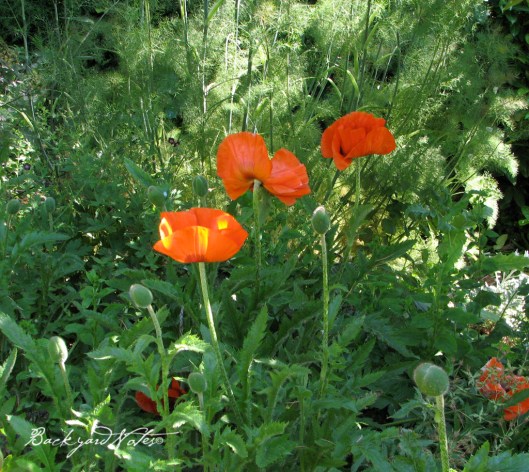 This orange papaver orientale is from our former neighbor, Mrs. Gould. She was clearing out a flower bed and gave me a few roots. She moved to a retirement home in Issaquah four years ago, so when they begin blooming I am reminded of her. They are just now blooming in my garden, more than three weeks later than most everywhere in my neighborhood due to a somewhat shaded location. They are like bright lights in deep shade and look good combined with fennel. They too have a tendency to spread but are easy to control.