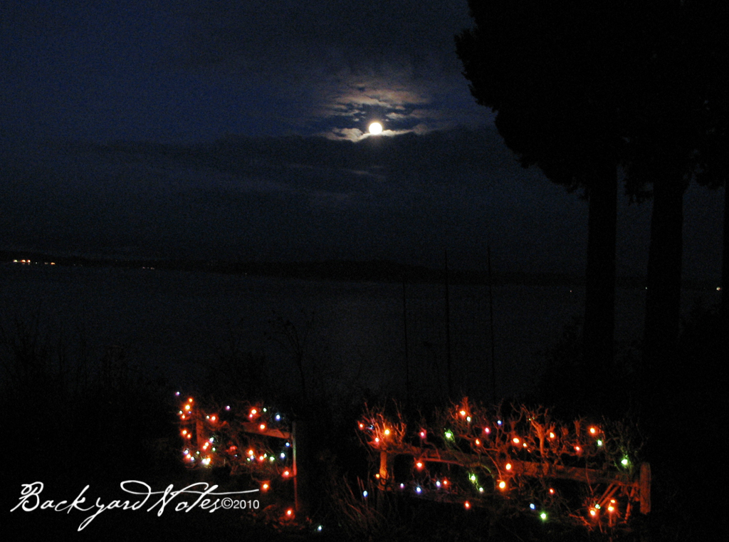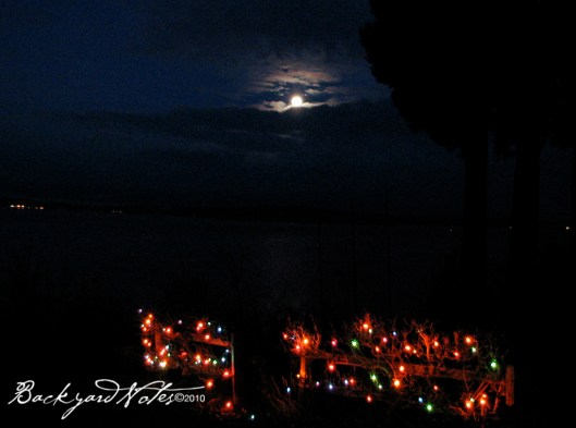The first day of winter here revealed a beautiful full moon that set as the daylight grudgingly began around 7:30 a.m. Not the greatest photo, but kind of neat with Christmas lights on the fruit trees.