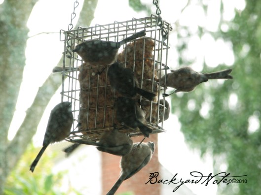 A FEW WEEKS AGO I hung up a suet feeder outside my office window for the flock of bushtits that pass through here twice a day. They were here this afternoon and mobbed the feeder; there are as many as twenty or more at times. They tiny, charming, and great consumers of insects (good!). It is also a treat for the Red-shafted flickers too.