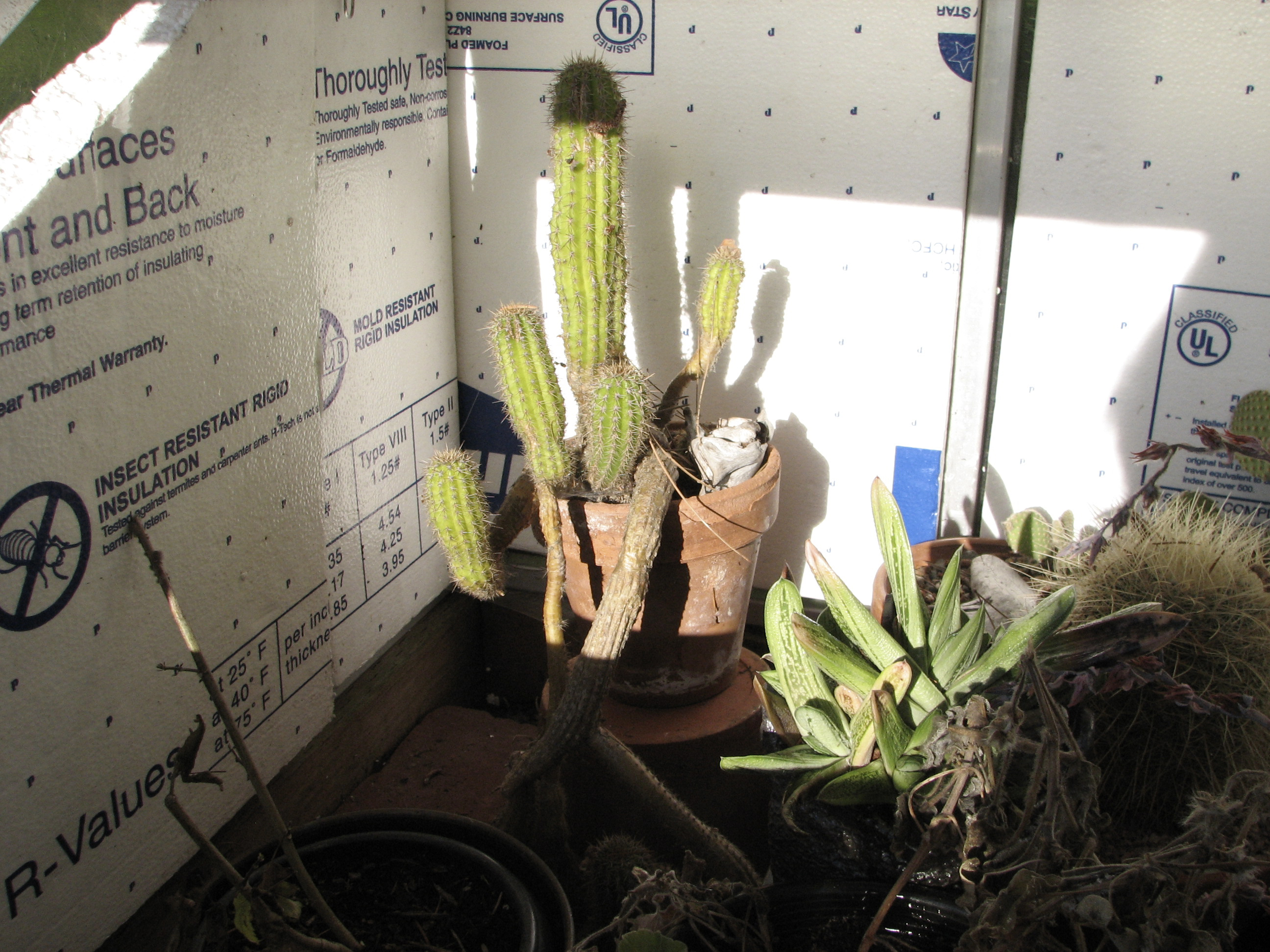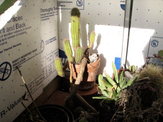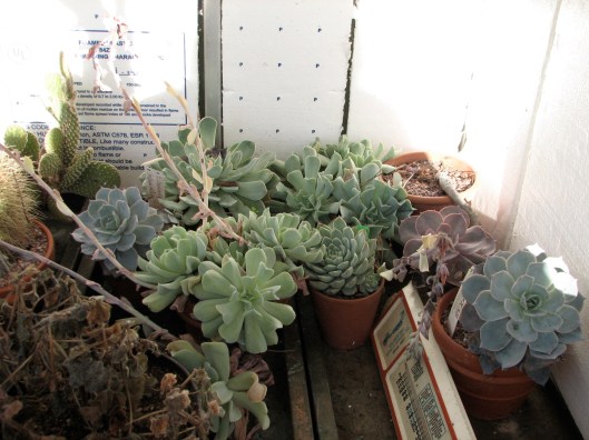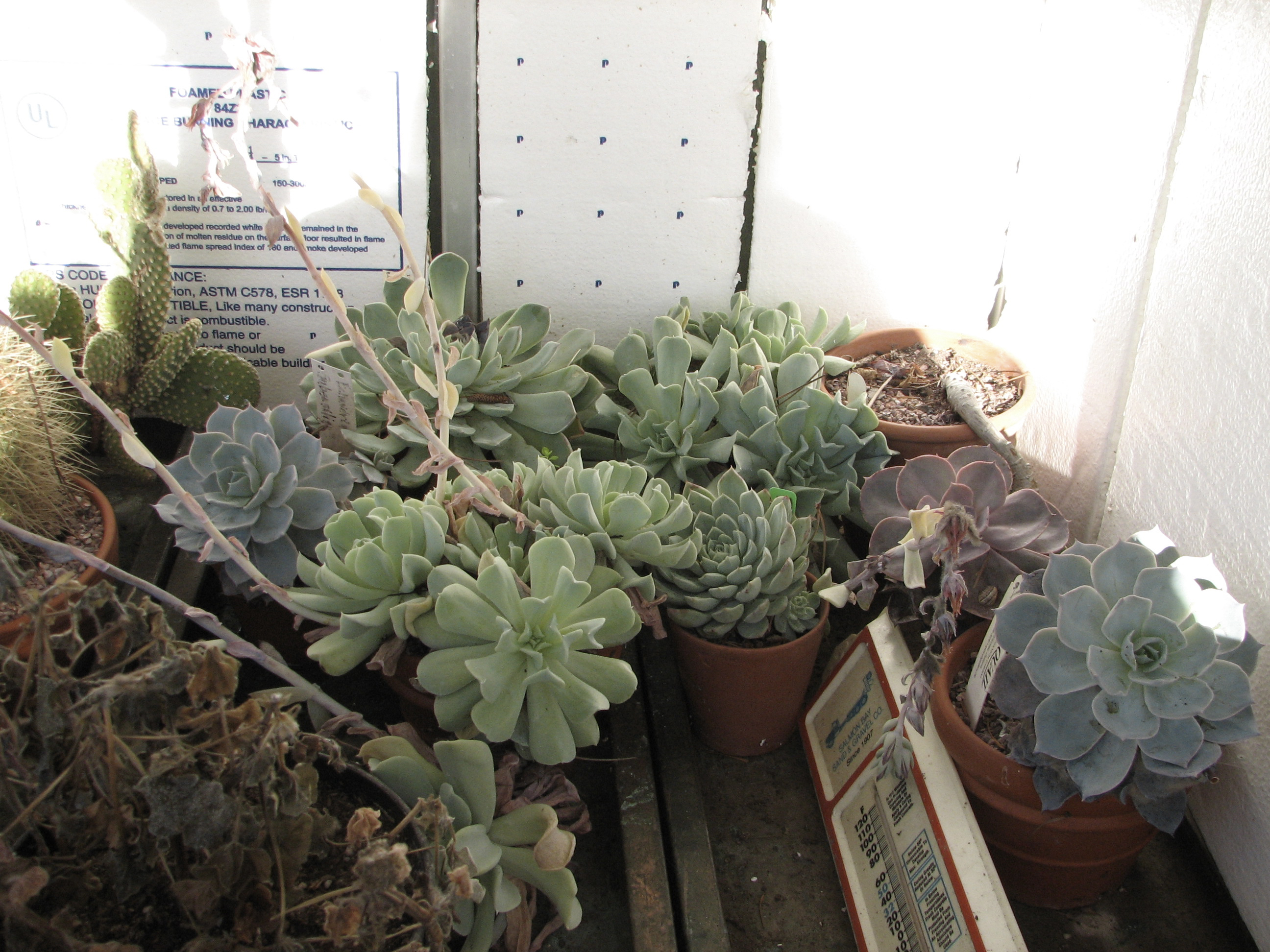 A quick check into the coldframe to see how the echeverias and other cactus are faring so far this winter. So far, so good.