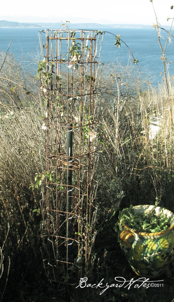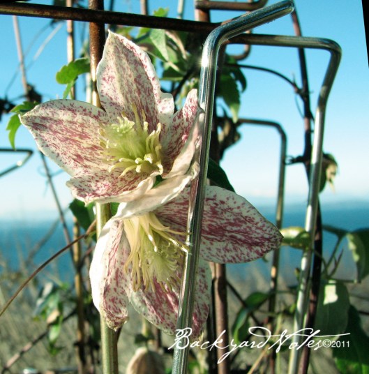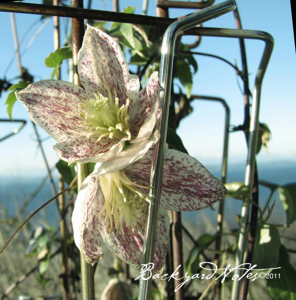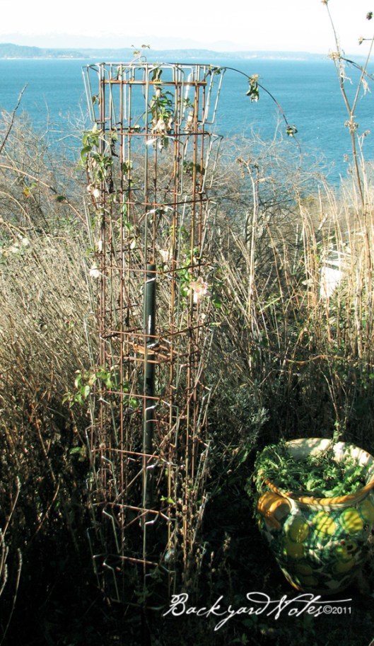 WE FOUND clematis cirrhosa ‘Ourika Valley’ last summer at Swanson’s Nursery; it seemed a novelty, but it is blooming despite the daily sub-freezing temperatures. I had nearly forgotten about it until today when I stepped to the edge of the lawn to snap a photo of the snowy Olympic Mountains–and there were two flowers, radiant in the sunshine. One of our daughters gave me an old card rack and it just sat around the potting table area rusting until Tom came up with the idea to use it as a trellis! This clematis should grow ten to twelve feet, so it can cover the rack over time. Curiously, the actual flowers and the photo on the tag do not correspond; the tags shows lime-yellow flowers!