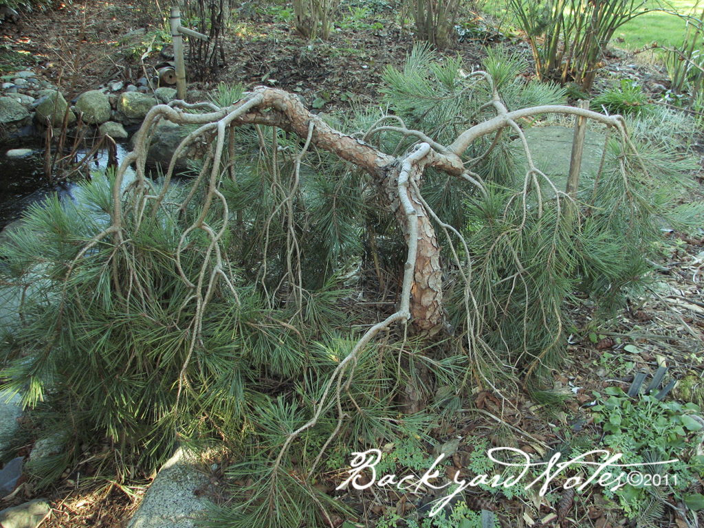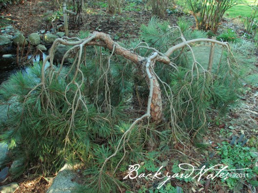 This weeping Japanese Black Pine that really gets to show off its form during the fall and winter months when all the herbaceous plants that surround it are dormant. We found this at a tree nursery out in Redmond (next to Bamboo Gardens of Washington and no longer there) that specialized in rare, unusual and species size trees. We planted it about thirteen years ago and it hangs over my soon-to-be renovated pond. The chickadees find it an especially attractive perch and I can view them both from my office window.