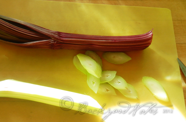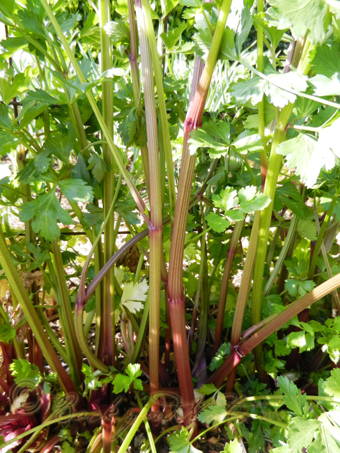 Last spring I planted Red Venture celery. The leaves have a strong celery flavor and were useful in soups, herby pesto type mixtures and a few leaves chopped and added to winter greens salads. The stalks were slightly bitter. Now the plants are bolting. When I cut the bolting stalk, it seemed tender and I sample a slice–sweet and tender!