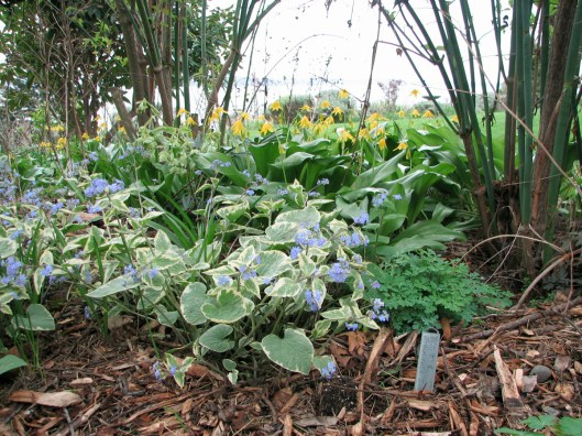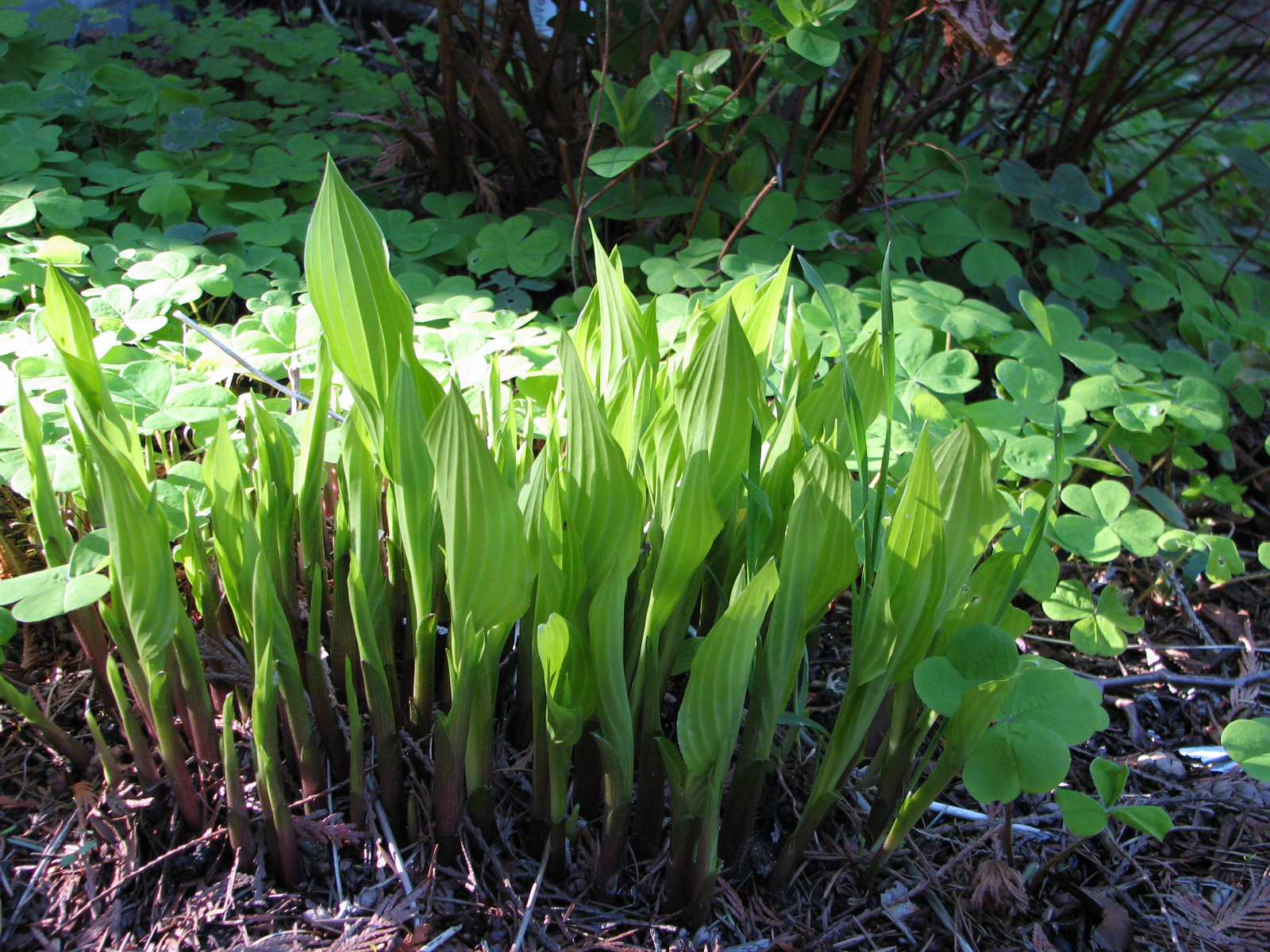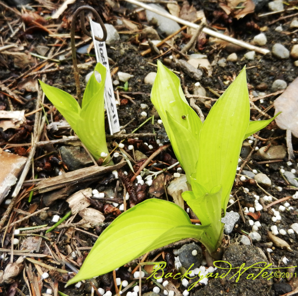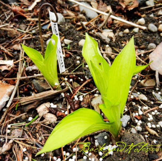 I think that one of the most lovely forms in early spring are emerging hostas. They seem elegant and the color is so fresh. This is a new one, June Fever, from Naylor Creek Nursery, one of four hosta varieties that I purchased from them at the garden show in late February; the others are ‘UFO’, ‘Clear Fork River Valley’, and ‘Blue Angel’.