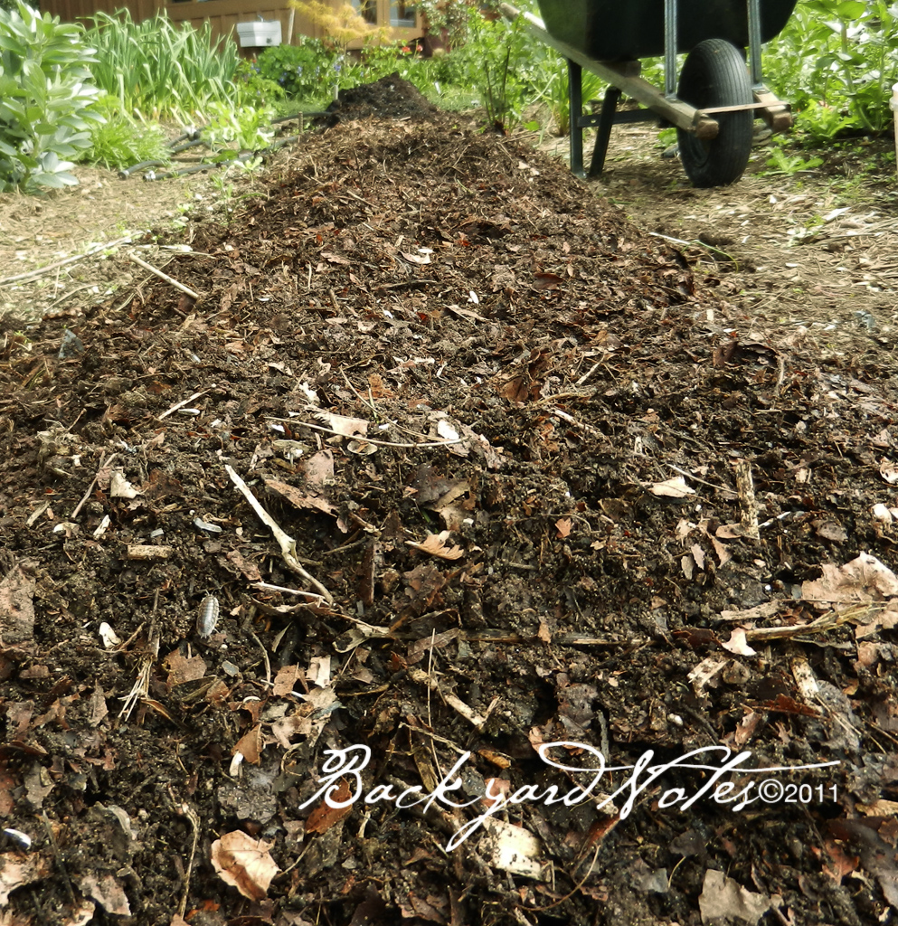 COMPOSTED CHICKEN MANURE is the last layer. Since I don’t raise chickens I have to buy this product. I became a believer in chicken manure when I used to raise chickens many years ago. I now favor Gardener & Bloome products after an unpleasant surprise (chicken bones in all 18 bags!) with Whitney Farms chicken manure two years ago. The Gardener & Bloome product is better composted and has less odor.