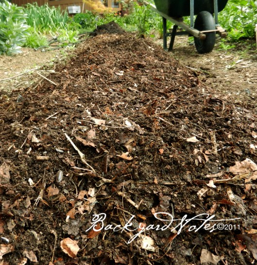 COMPOST is the second layer and piled on about three to four inches thick. I used to sift the compost, but it was so much extra work and all it really achieved was to remove some sticks and stems not fully composted. I finally decided that the compost could finish breaking down in the beds; it has worked out well ever since. Anything that is obviously large or not broken down is pulled out and returned to the bin. I’m happy and so are the plants.