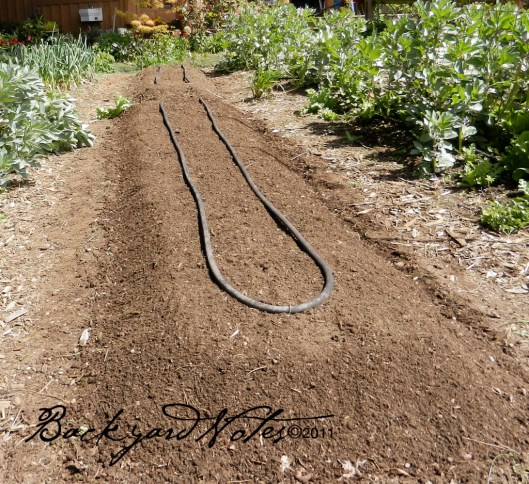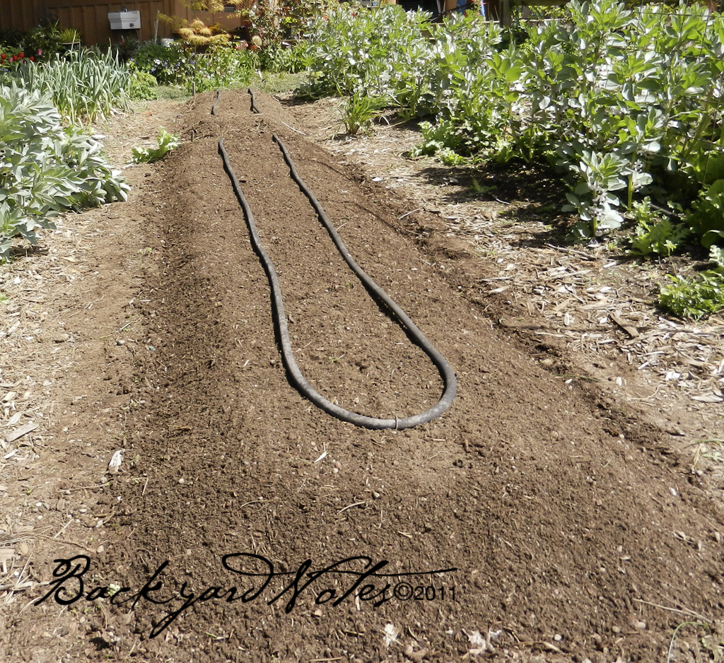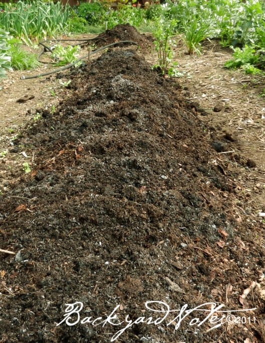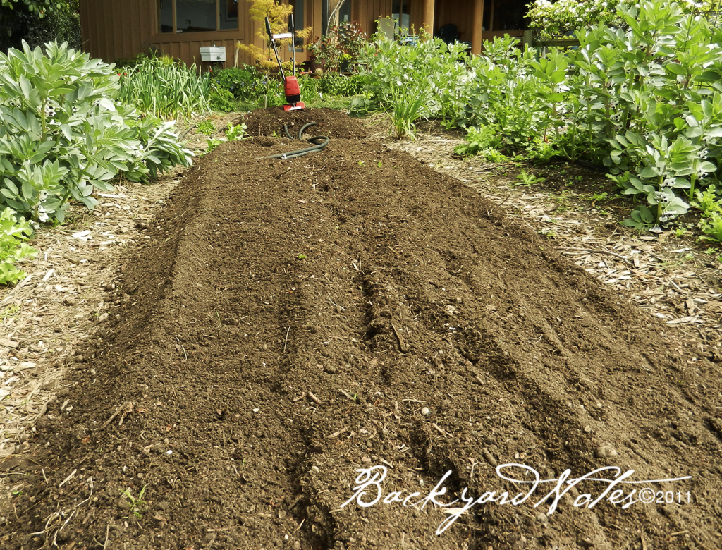 FINAL STEP is raking into shape. The raised beds are about twelve inches high and about thirty-six inches wide when finished. I water with rubber drip/soaker hose. The paths between the beds are just wide enough to maneuver a wheelbarrow through and covered with wood ‘play chips’ to keep the weeds and the mud down.