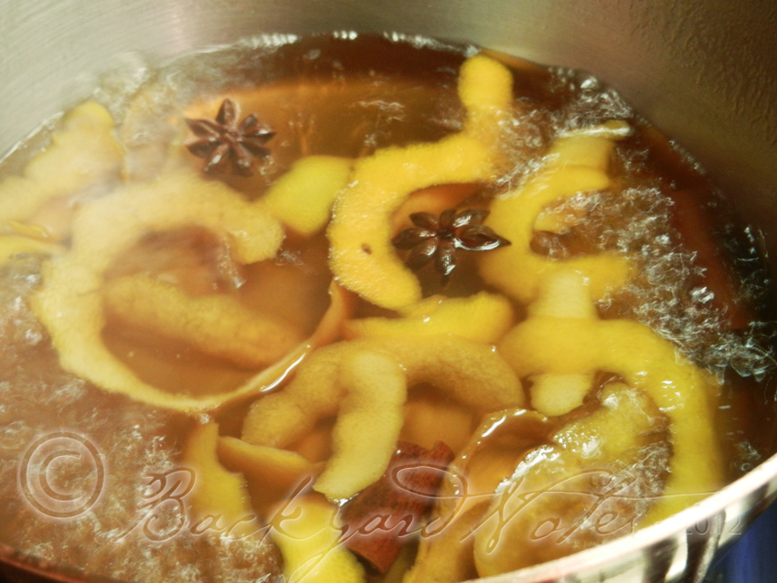 I liked the jelly so much that I asked my mom if her neighbors had more apples. Yes, they did! How about twenty pounds of Winter Bananas? Please take them! Half of them went into a small fridge and the rest sat in their box in the garage. In early December I made a second batch of apple-cranberry jelly. Ten pounds of winter Banana apples, three pounds of Oregon cranberries, two large pots and two cups of water; this time I ended up with four and a half quarts of juice so I made two batches of jelly. One batch was straight forward and the second included the addition of port and star anise. Yield: 8 half-pints of jelly.