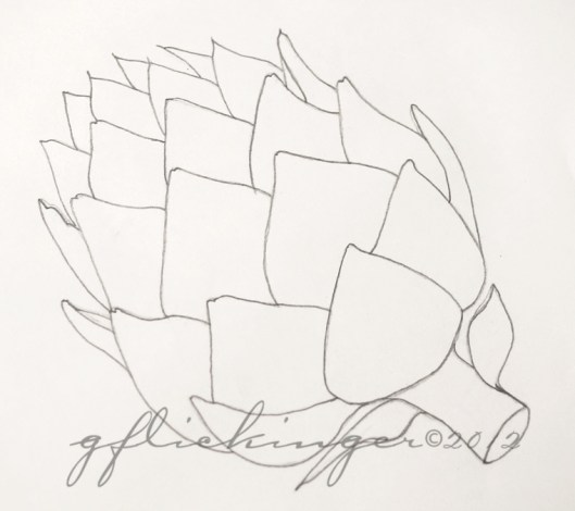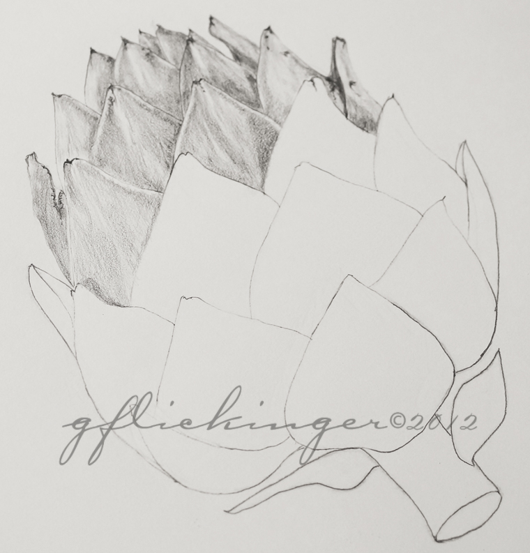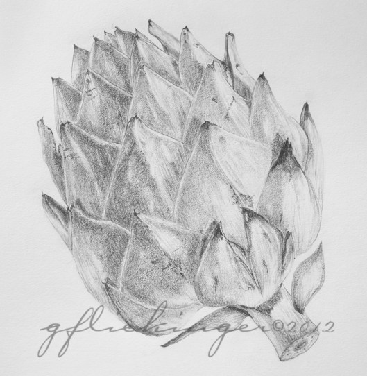 I never thought I would have the patience to accomplish something like this. Just a few HB pencils and tools for measuring are all I need to produce some beautiful drawings. After the completion of the August classes I enrolled in Kathleen’s class for fall quarter (10 weeks!). With each successive drawing the task becomes a little easier and faster. The artichoke took one class session to complete the line drawing (amazing!) but many, many hours to finish the drawing and bring it to life.