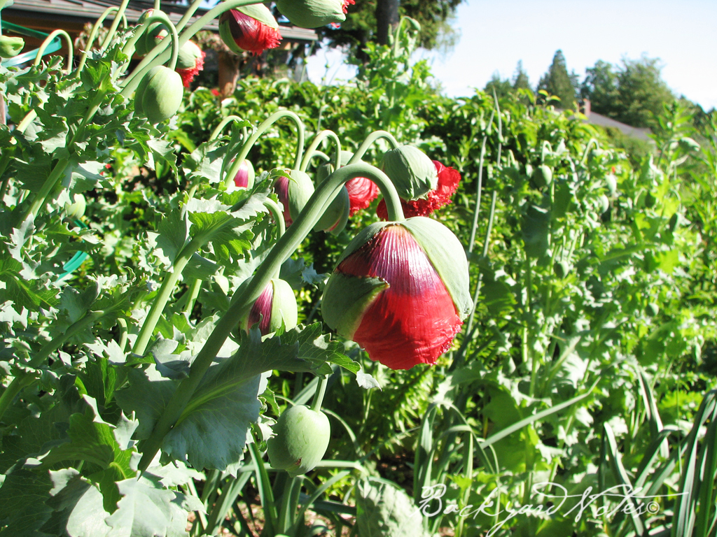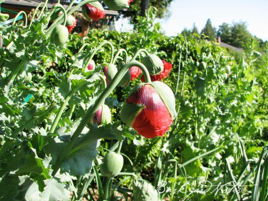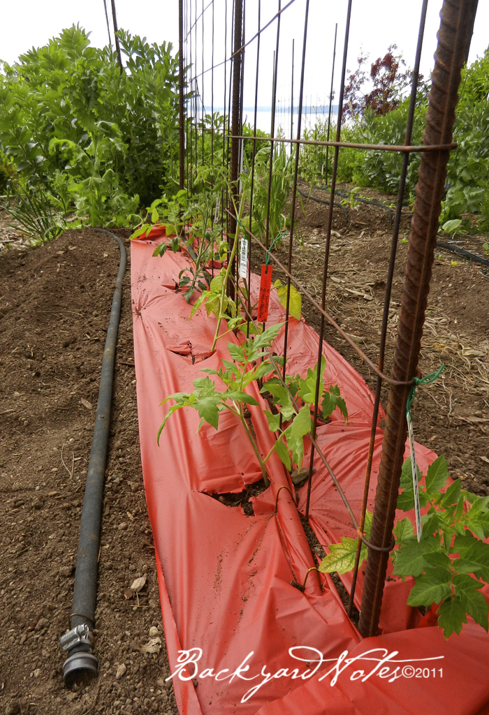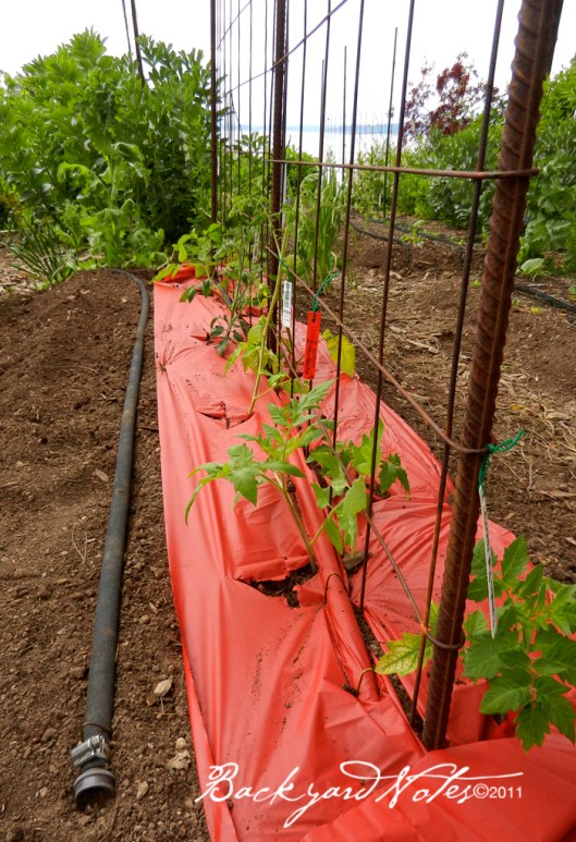 And, I think that we have finally hit the 50° for steady, average overnight temperature (I hope). On Sunday I put some of the tomatoes into the ground. As you can see from the photo above, I am using SRM-Red Plastic Tomato Mulch. I bought this product from Territorial Seed Company a few years back and never got around to using it. Yesterday afternoon the soil temperature 6″ below the red plastic was 64°, while 18′ away the soil temperature was 59°; so it makes a difference. I will use this same technique with some of the remaining tomatoes and plant some without at the same time for a control.