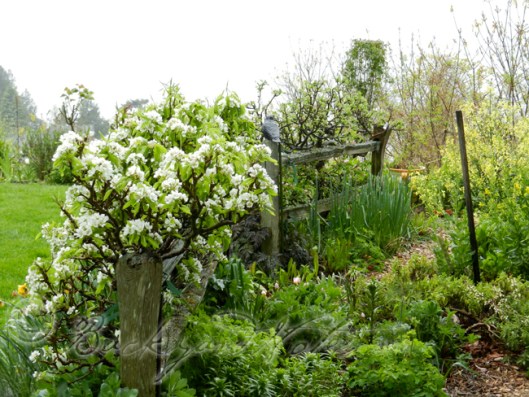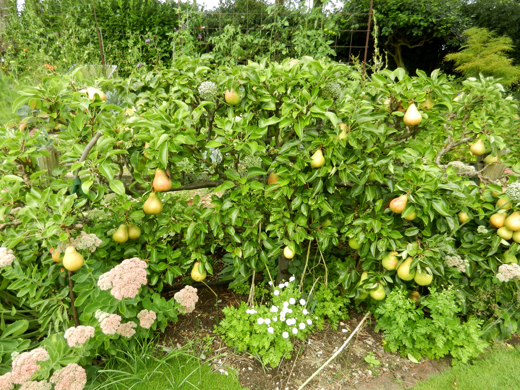 WE PLANTED THIS PEAR TREE in 1996 or 1997. It has three varieties grafted on dwarf root stock. The tree is supported against a split rail fence, 32 inches tall and 8 feet wide. The varieties are Comice, Rescue and Bartlett. By the fourth year it began producing a reliable crop of pears and this year I harvested a whopping 72 pounds!!!