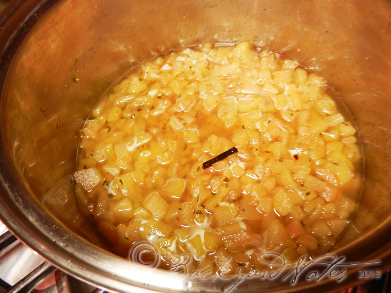 I let the pears and sugar macerate for six hours to draw out the juices. I brought the fruit and its juice to a gentle boil over medium high heat for five minutes then reduced to a simmer (barely bubbling) and continued cooking for about 4 hours until the pears were soft, translucent and thickened.