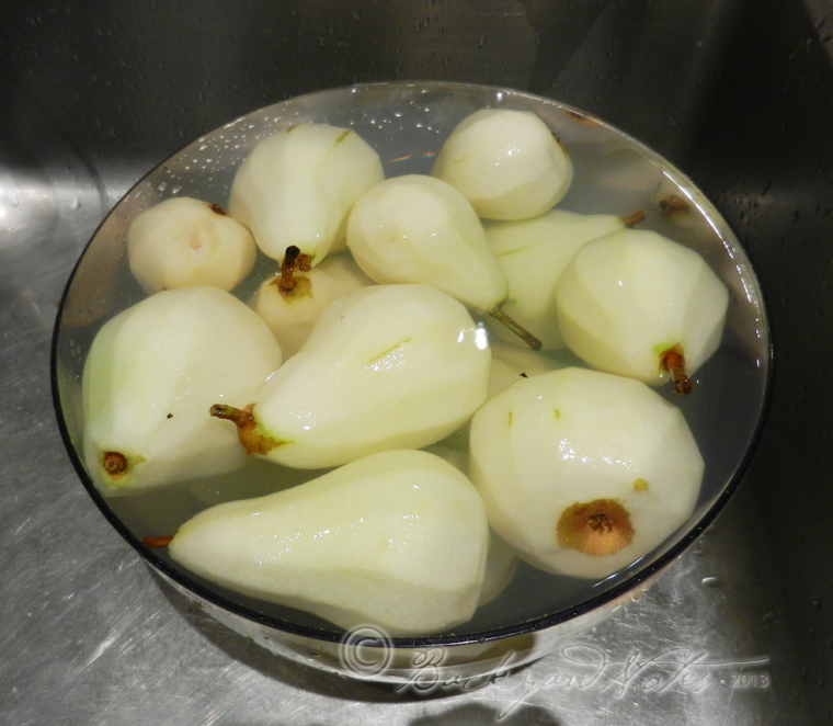 So far, I have processed 6 half-pints of Pear-Thyme Conserve (Well Preserved); 4 half-pints Pear-Ginger Preserves; 6 pints Pears Poached in Wine; 7 pints plain canned pear quarters; 4 half-pints Pear Preserves with dried cherries. I gave pears to friend, neighbors and relatives. Yesterday I put up 5 1/2 half-pints of Pear Preserves with Vanilla and Thyme.