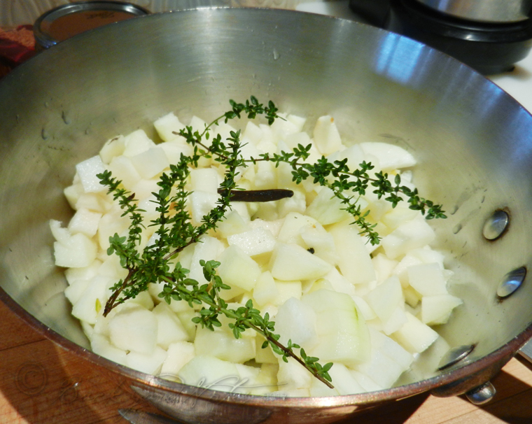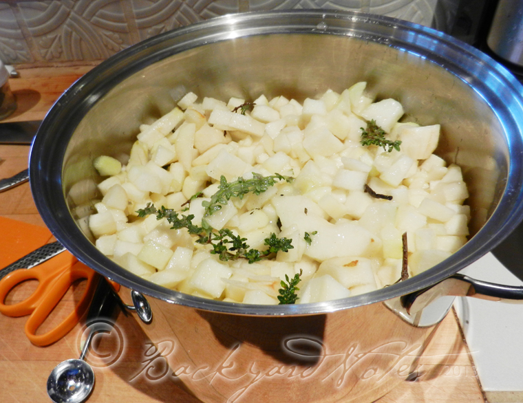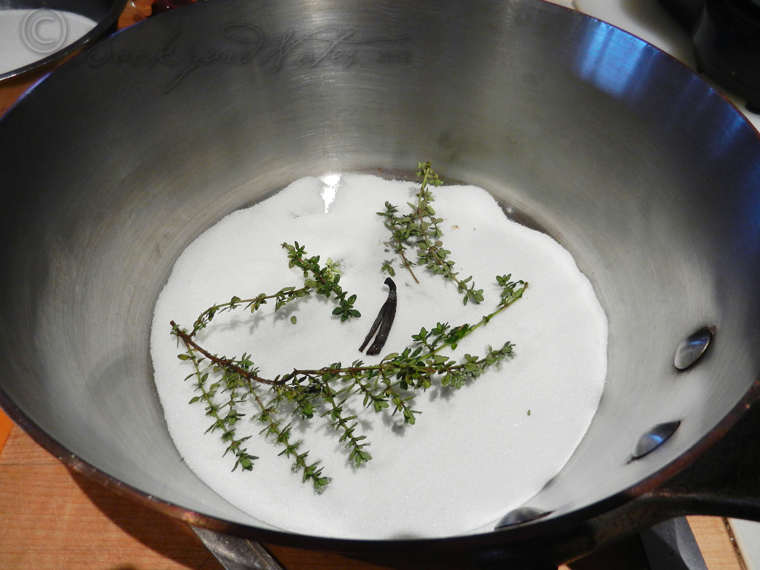 I started with six pounds of pears. I peeled, cored and diced the pears, then layered them in a large saucepan with 17 ounces (2 1/3 cups) sugar, 4 large sprigs of thyme and one six inch vanilla bean cut into four pieces.