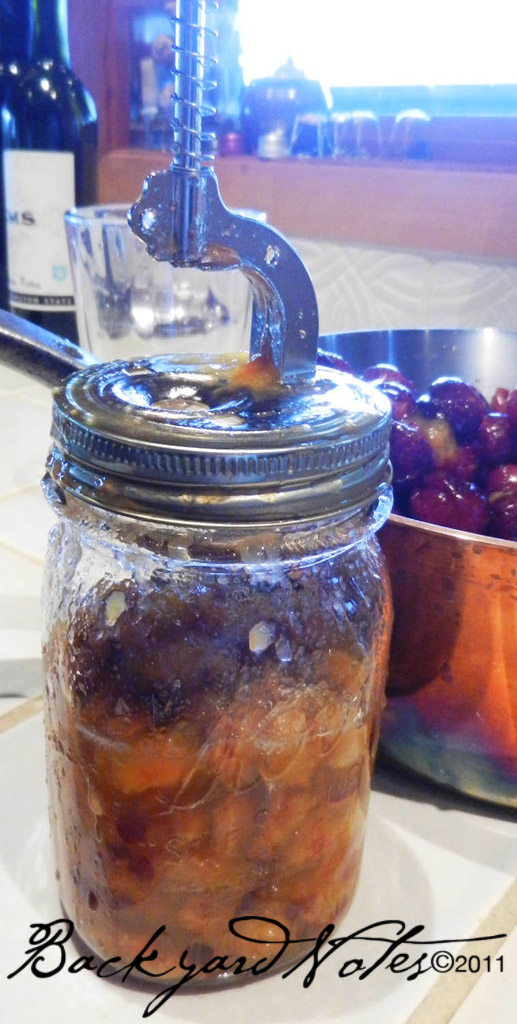 This quirky looking gadget was a birthday gift this summer from one of my sisters. I forgot all about it when I pitted pounds of cherries in July and August. But I remembered to try it out with the cherry plums. The pitter sits atop a narrow mouth jar and is fixed in place with a screwband; the pits drop into the jar. Worked pretty well.