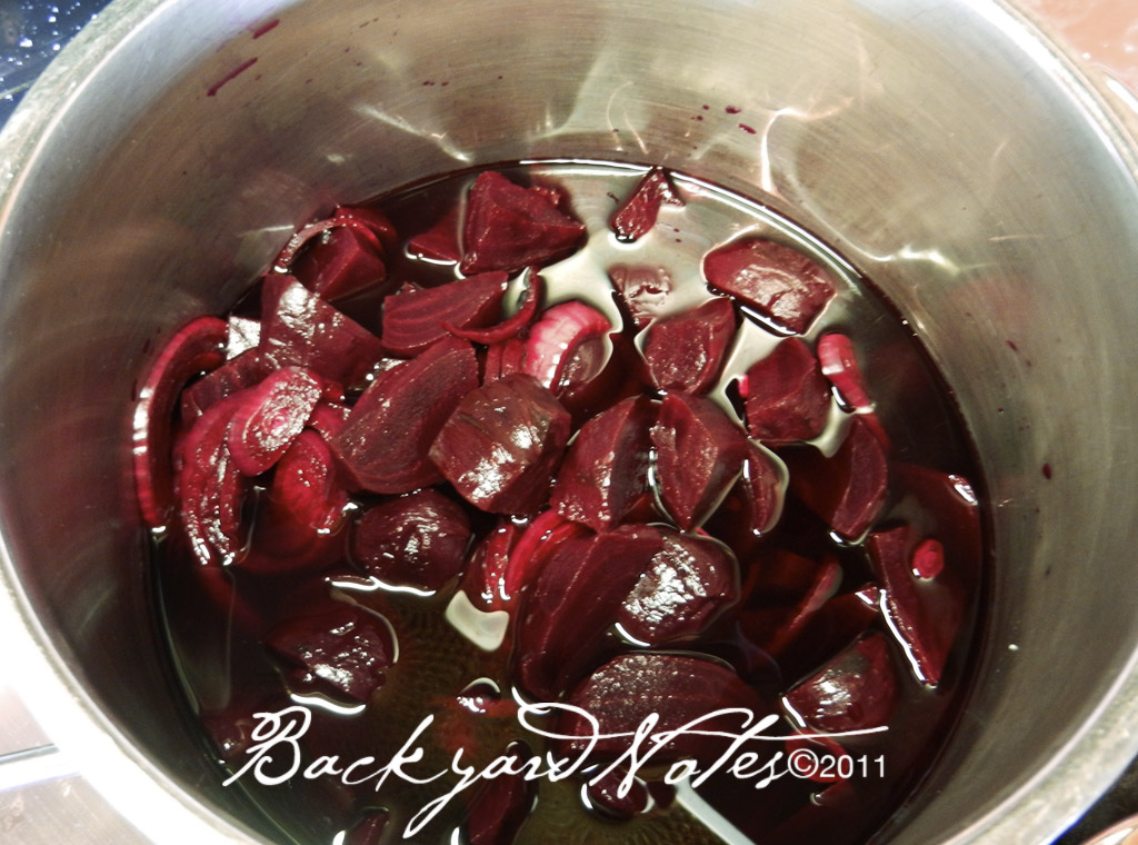 Speaking of the Labor Day weekend, my neighbor and a friend of hers spent the weekend canning. They filled 210 jars with blackberry jam, tomato salsa, bruschetta topping, dilled green beans, pickled beets, and more. On Friday they offered me some of the 25 pound (!) bag of beets that they had bought, so I made pickled beets too (six pints).