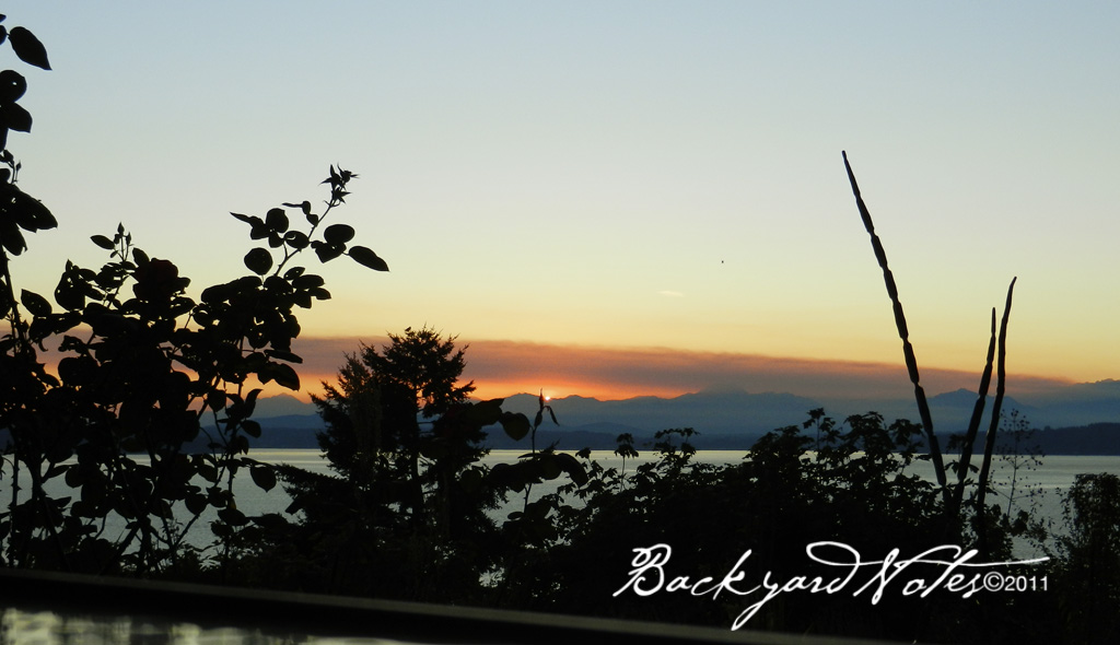 TWO BODIES OF WATER AWAY TO THE WEST are the Olympic mountains and on the south side of Mt. Jupiter there is a week-and-a-half old fire, about 1,100 acres so far. Since the Labor Day weekend we have had smoky, red sunsets. As we move towards fall, the sun sets a little earlier every day; this week around 7:30 p.m. Summer is so short!