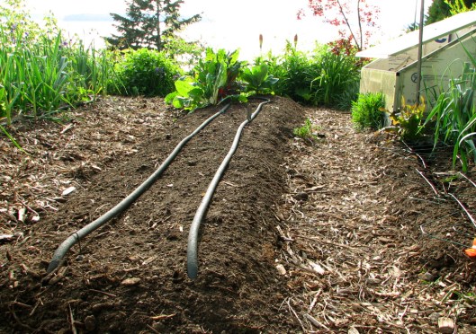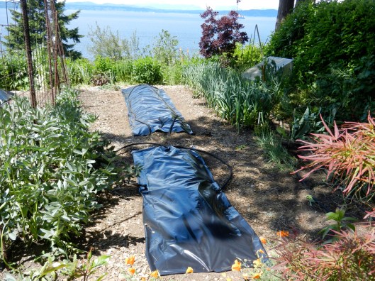 When I put the garden to bed before our long trip I used heavy black plastic to keep the weeds from taking over. And so far, the only unwanted seeds that have sprouted are squash, melon and tomato seeds from the compost that I laid down for the fall garden. Weeds are blessedly absent!