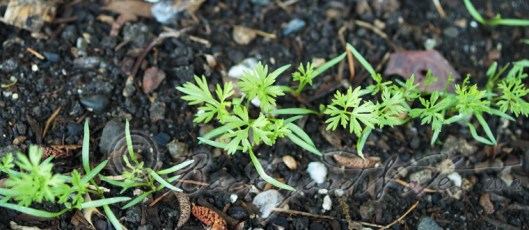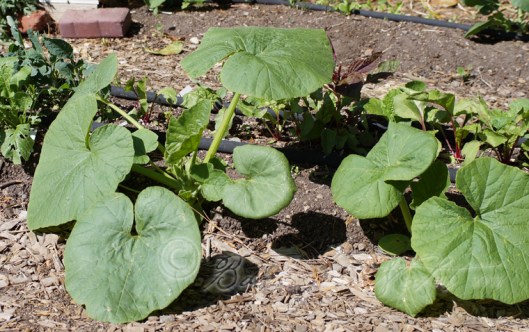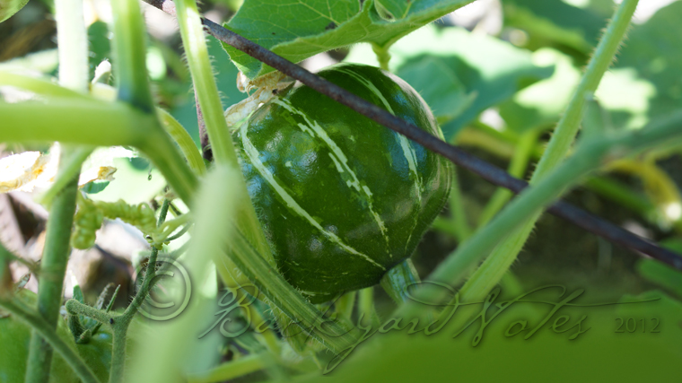 Although it is really late in the season to see any productivity from these volunteers, I have left a few of the squash (melon? cucumber?) seedlings to see what develops.