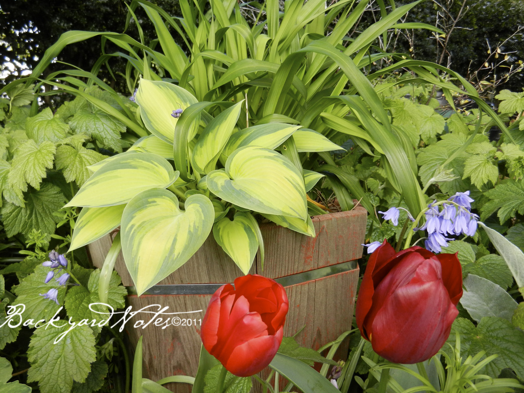 I like unexpected little vignettes, like this one with the hosta ‘June’, wood hyacinths, and a few of the ‘Valentine Candy’ tulips.