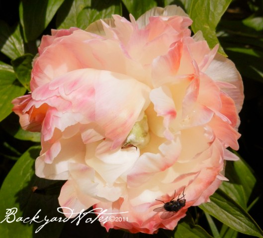 THIS LOVELY PINK TINGED PEONY has, to me, a very feminine, girly aspect. Ruffled edges like a crinoline petticoat. It will change from pink to pure white.
